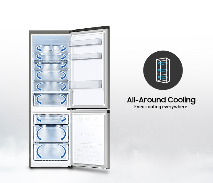 Ustrezno ohlajanje živil na vseh policah in v vseh kotičkih. Vsestransko hlajenje ohladi hladilnik enakomerno od kota do kota. Hladen zrak piha iz strateško razporejenih šob in ohranja stalno temperaturo. Tako je ohlajanje učinkovito na vseh policah, živila pa so bolj sveža.